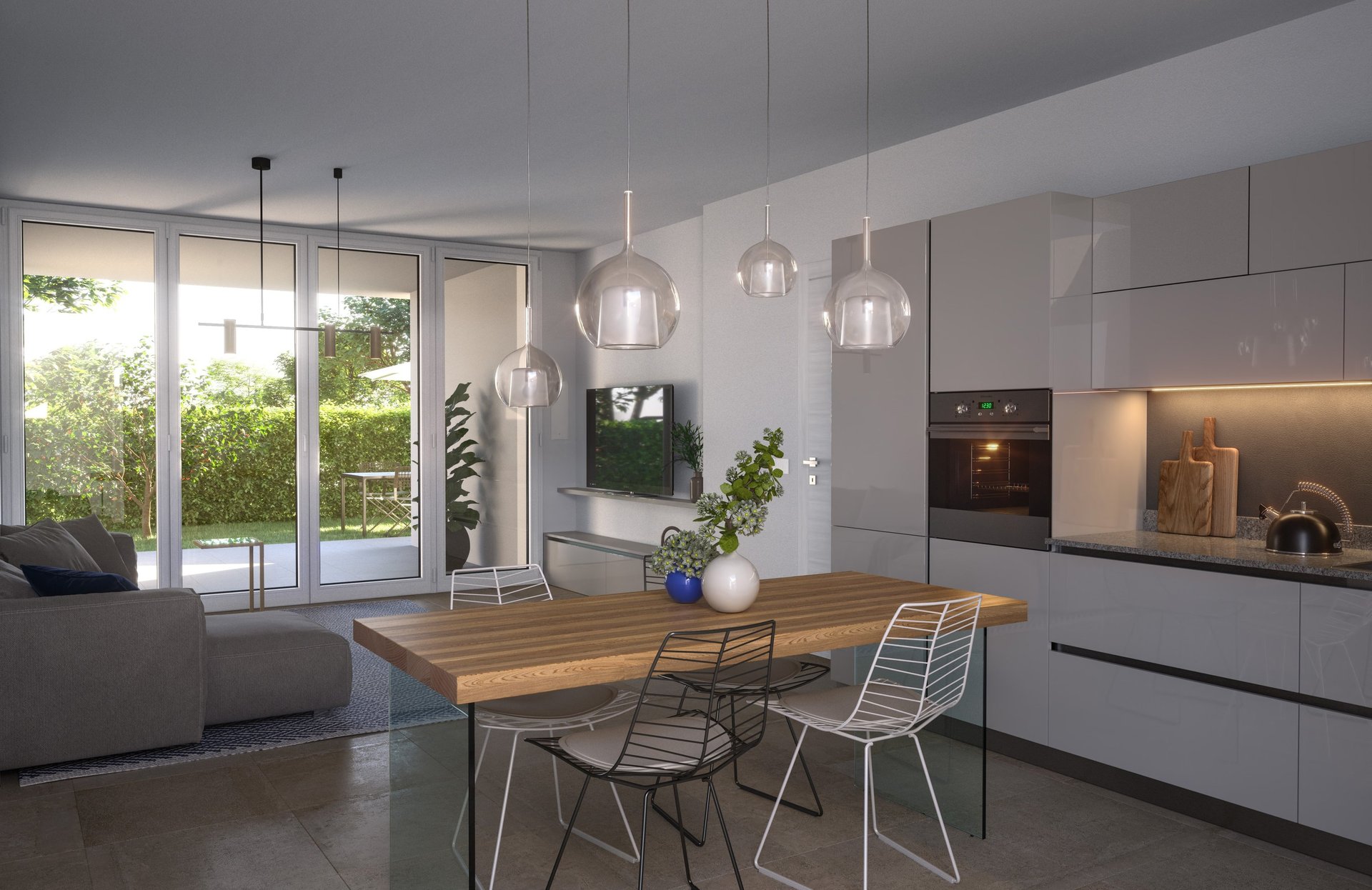I pavimenti e rivestimenti interni sono previsti in gres porcellanato opaco. Per le zone esterne saranno previsti anche del tipo "Grip".